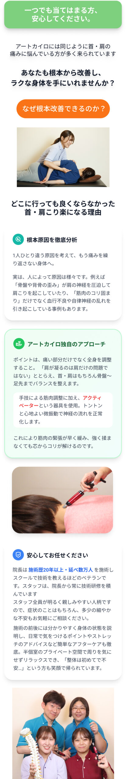 首や肩の筋肉をもみほぐしたり、電気治療等を行ってもらいその時は固くなっていた筋肉がほぐれて楽になると思います。一時的には楽になるけど、時間が経てばまた元に戻っていませんか?アートカイロでは、神経やリンパの流れの改善と骨格・筋肉の調整を行いますので、もっと施術効果が長持ちして、根本改善を目指していきます。